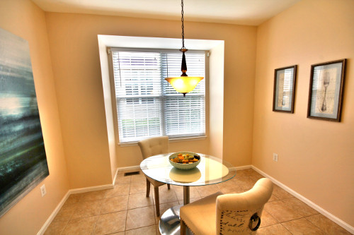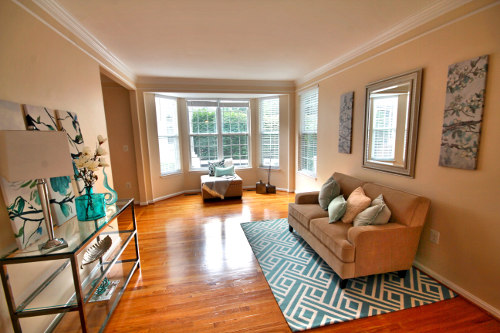 In these examples, the nook and the living room are well lit by windows but they are somewhat compartmentalized. The original furniture is large and dark which causes the room to look even smaller and does not take advantage of the light from the window. In the staged photographs, only enough furniture to give the buyer an idea for the room is used. The small glass table and silver base reflect light leave the nook feeling larger and airy. Additionally, the geometric patterns in the carpet and singular color scheme in the living room catch the viewer’s eye.